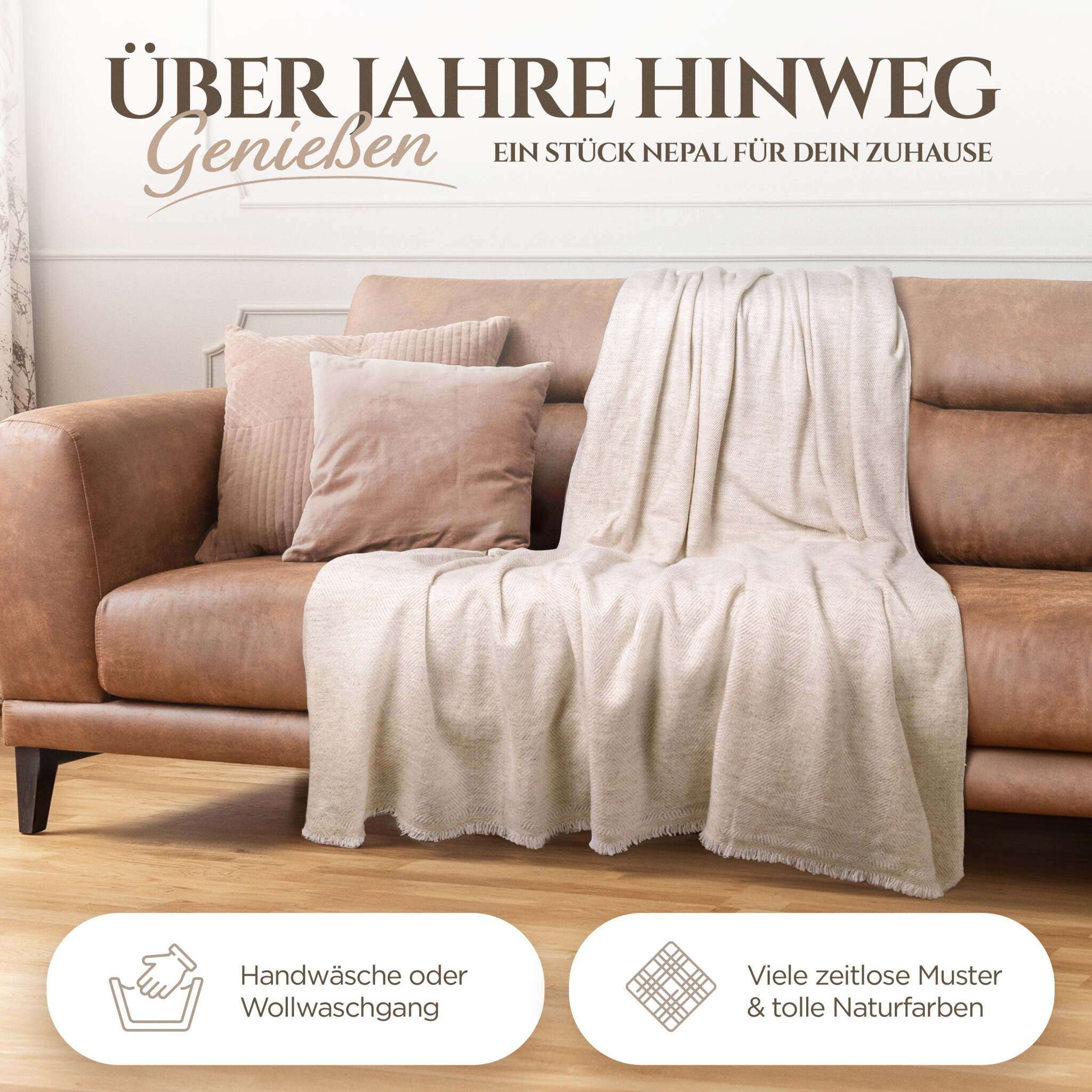 Kaschmirdecke beige mit feinem Fischgrätenmuster