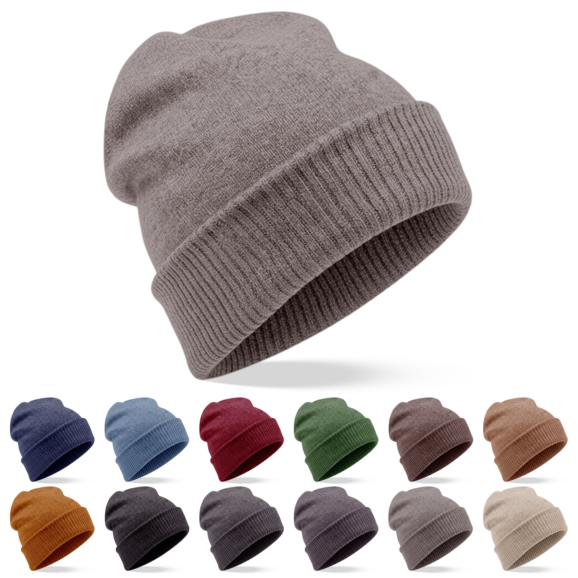 Kaschmirmütze Beanie glatt mit geripptem Umschlag Hellgrau