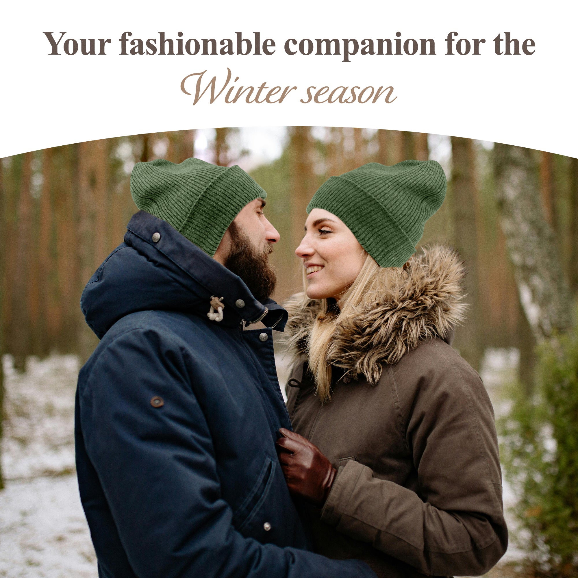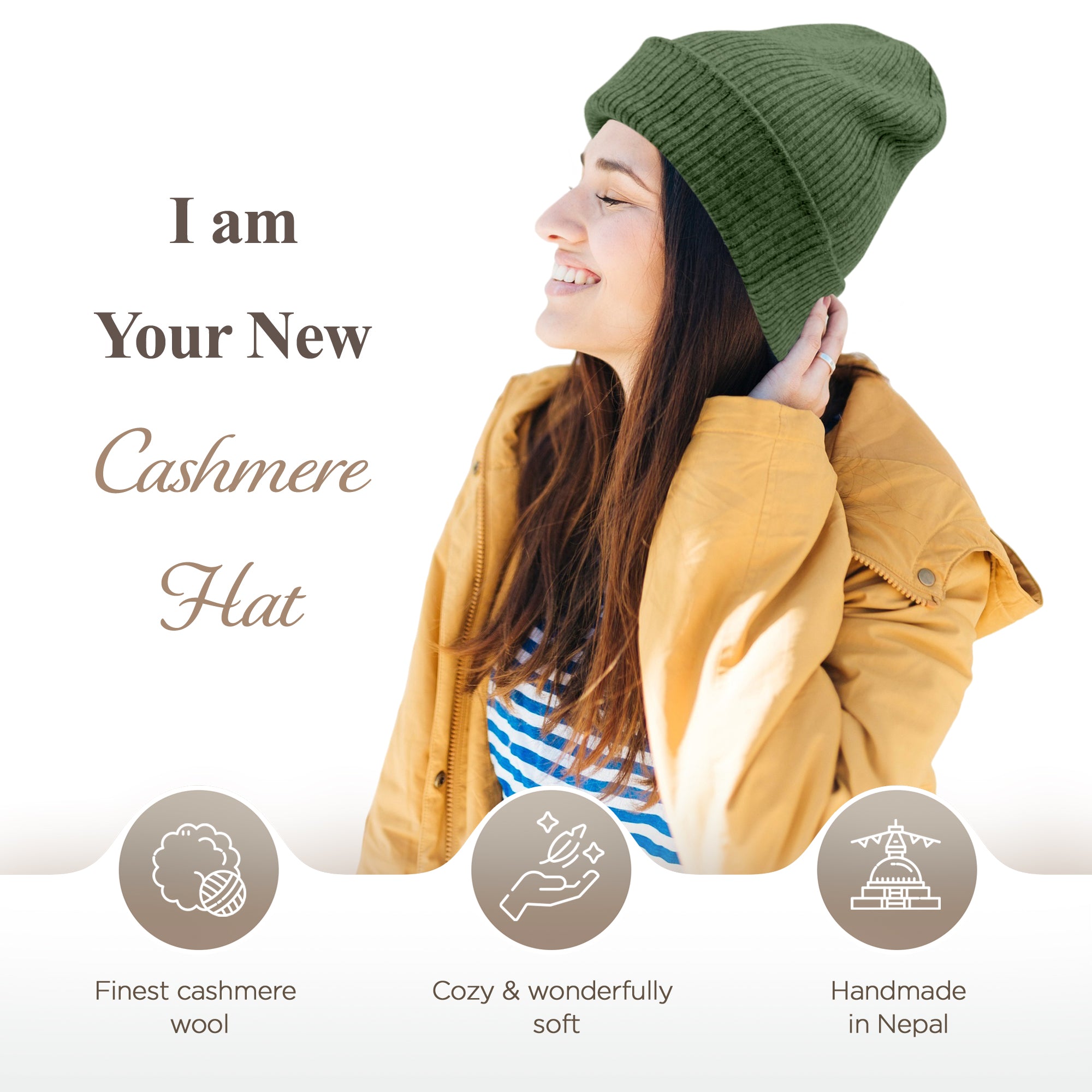 Kaschmirmütze Beanie gerippt mit Umschlag - Dunkelgrün