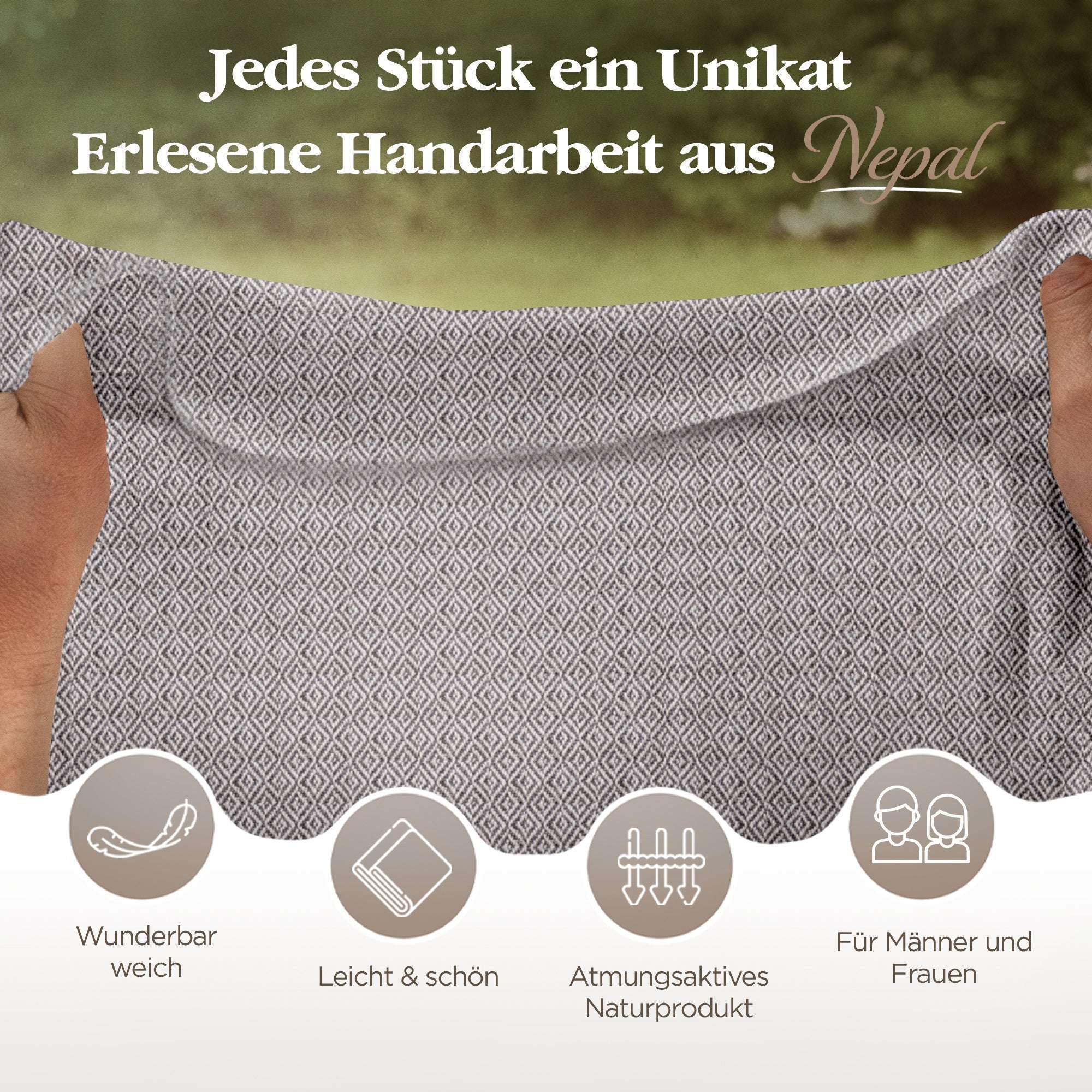 Die Pflege Ihrer Kaschmirprodukte ist einfach, wenn Sie ein paar grundlegende Schritte beachten. Handwäsche oder eine sanfte Maschinenwäsche im Wollwaschgang mit einem milden Wollwaschmittel wird empfohlen. Anschließend legen Sie den Stoff flach zum Trocknen aus, um die Form zu erhalten. Bewahren Sie Ihre Kaschmirwaren sorgfältig in einem sauberen, trockenen und luftdichten Behälter auf, um sie vor Motten zu schützen. Mit der richtigen Pflege können Sie die Schönheit und Weichheit Ihrer Kaschmirprodukte über viele Jahre hinweg bewahren. Wir bei Yanopurna sind stolz darauf, Ihnen die Schönheit und Eleganz der Kaschmirwolle aus Nepal näherzubringen. Unsere handgefertigten Decken, Schals, Tücher und Mützen sind nicht nur eine Bereicherung für Ihre Garderobe, sondern auch ein Symbol für Handwerkskunst und nachhaltige Praktiken. Wir laden Sie herzlich ein, sich in unsere Kollektion zu verlieben und ein Stück der reichen Kultur und Schönheit des Himalayas zu erleben.